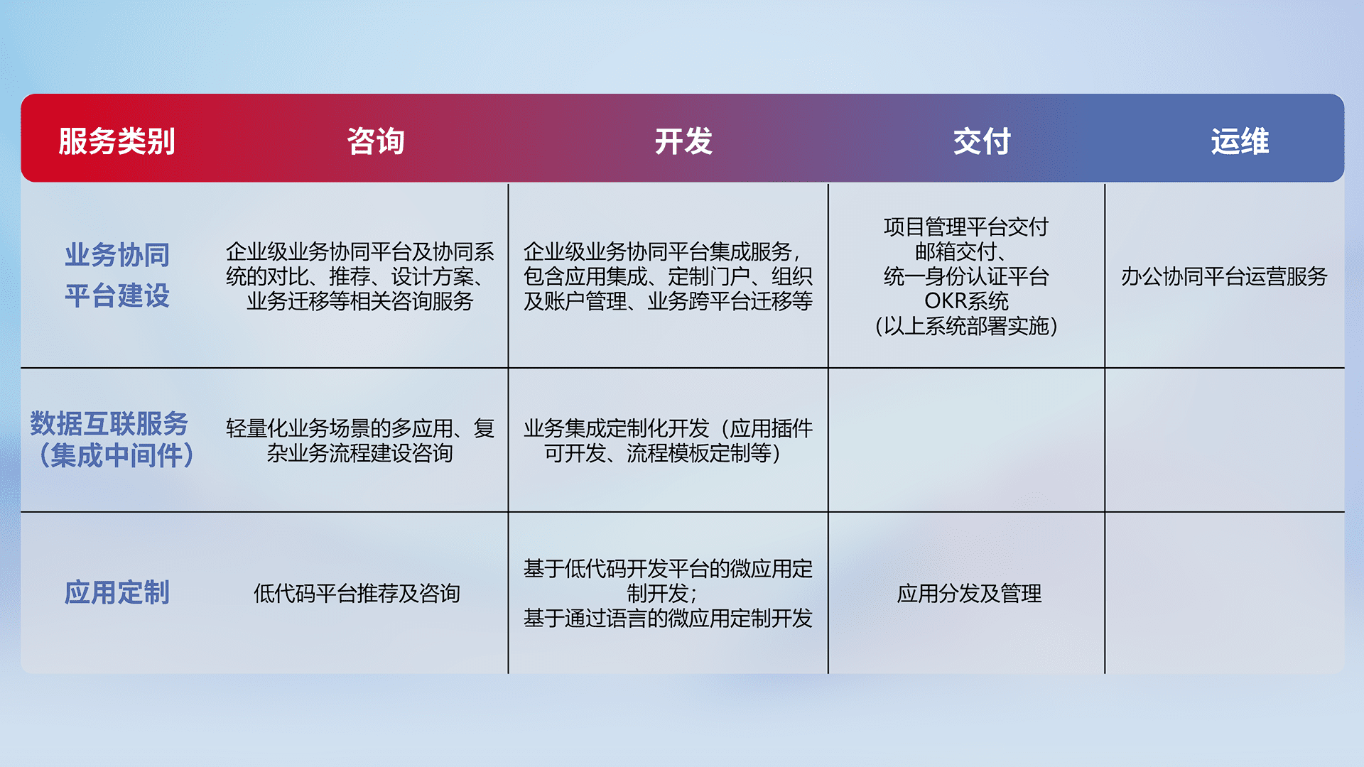 针对钉钉、、企微、、、、IDaas等平台级产品提供产品的规划、、、、方案、、交付、、、定制化开发等服务,,,实现如统一协同办公、、智能客户服务、、混合会议管理、、、智能数据查询、、、等业务场景,,实现数字化转型。。。。